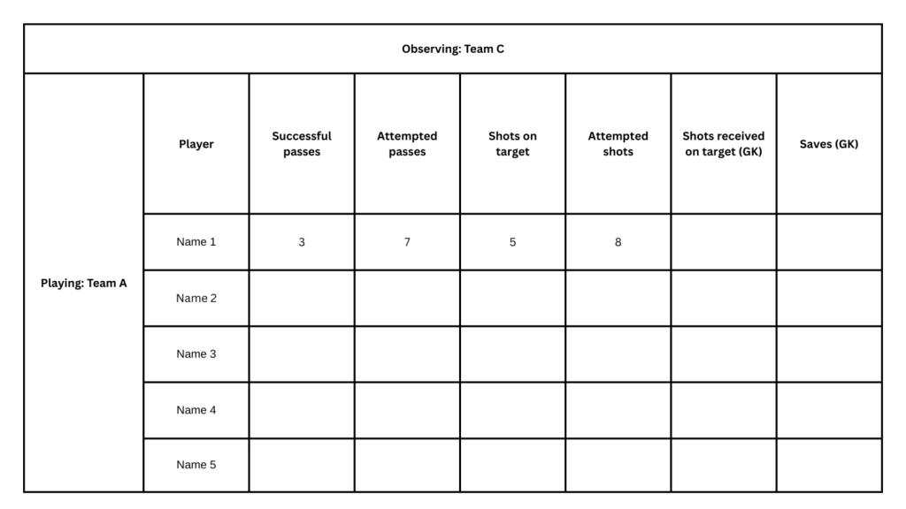 I divide students into four teams: A, B, C, and D. While A and B play, C and D observe. Then they switch roles. The observing teams collect real data to create player and team statistics.